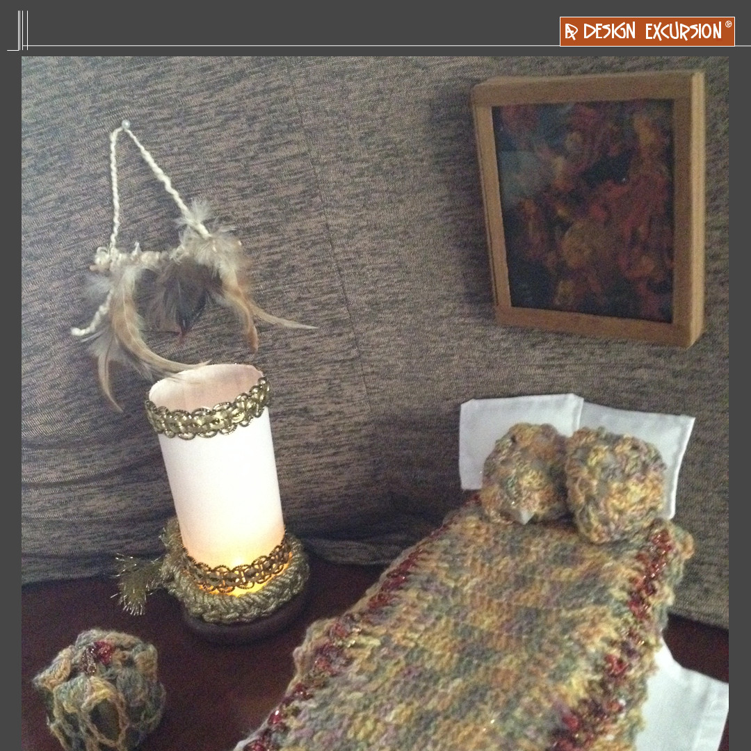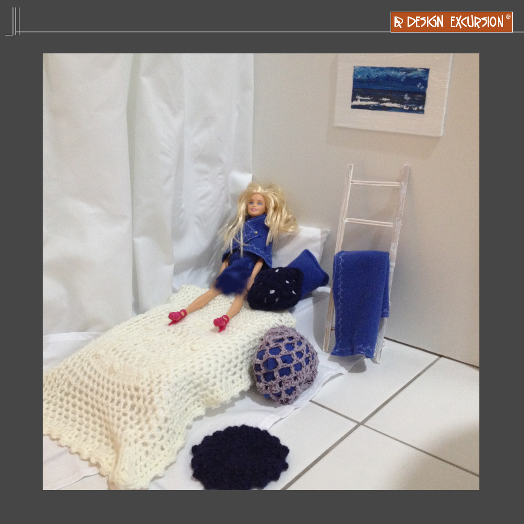 We created a ladder from sticks, and painted it white. A crochet bed cover, white sheets and pillow case, and a few interesting pillows. Add a rug and little painting of the beach - or cut out a picture and stick on cardboard.