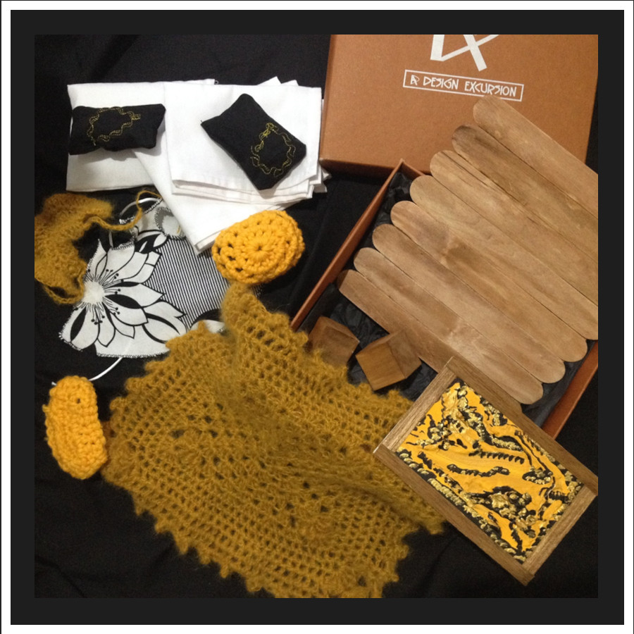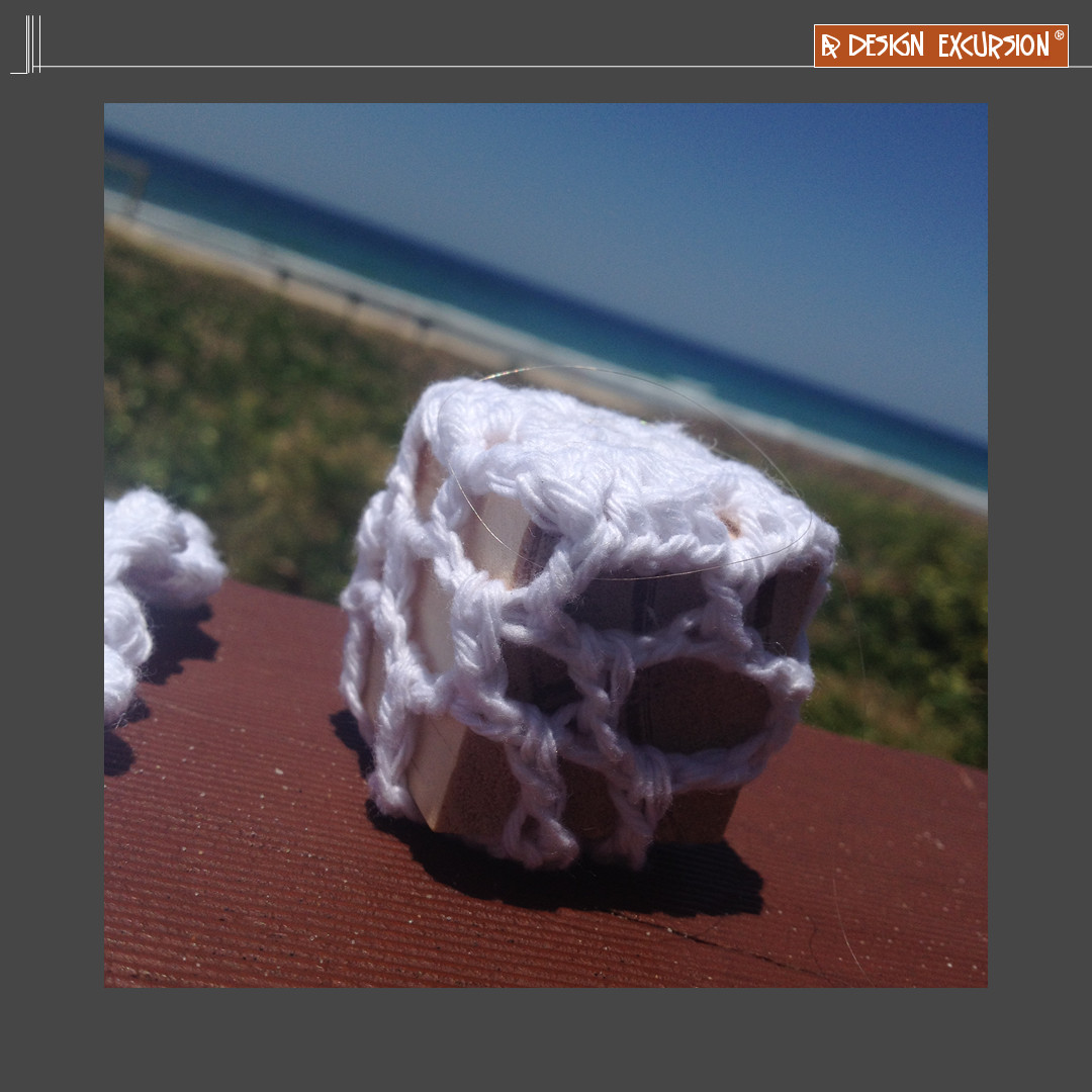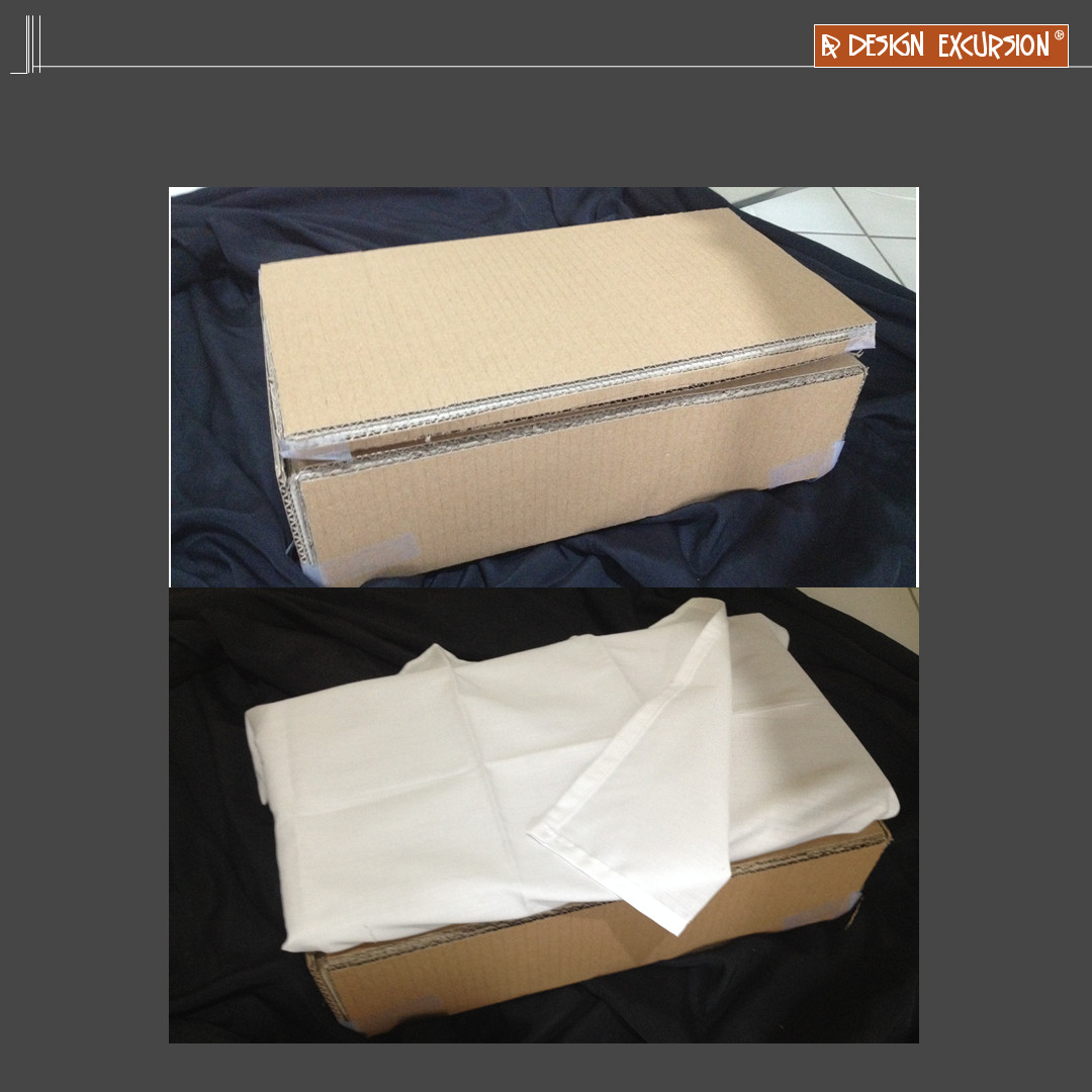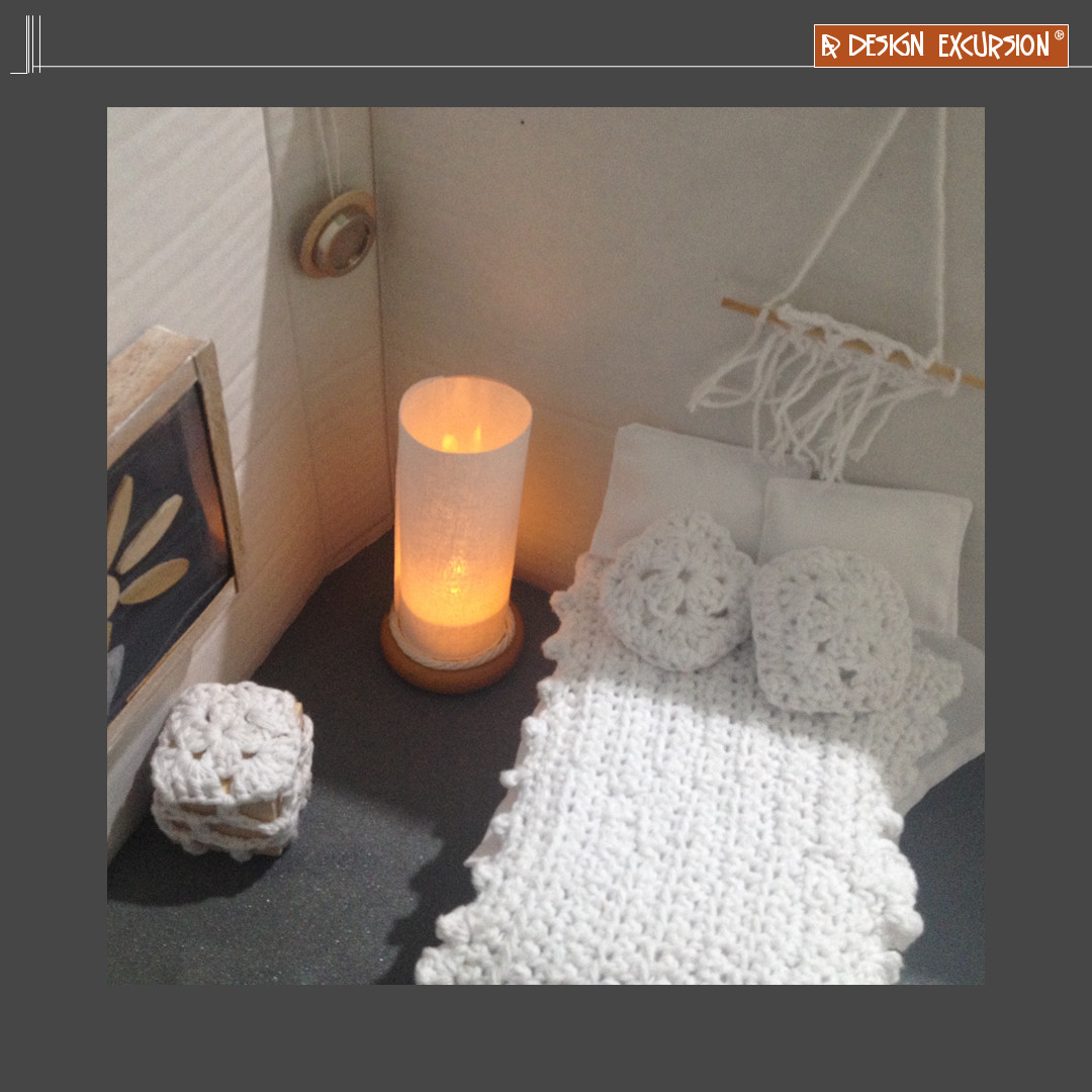 We found a hand dyed wool that had all the colours of a sunset. Creating a lamp which fits a tea light in it, and covered timber blocks for ottomans.