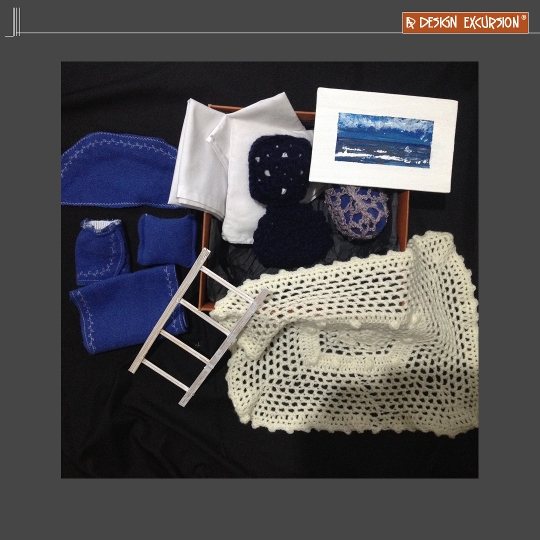 Collect fabrics, fibres and shapes around the house that are the colours of water.