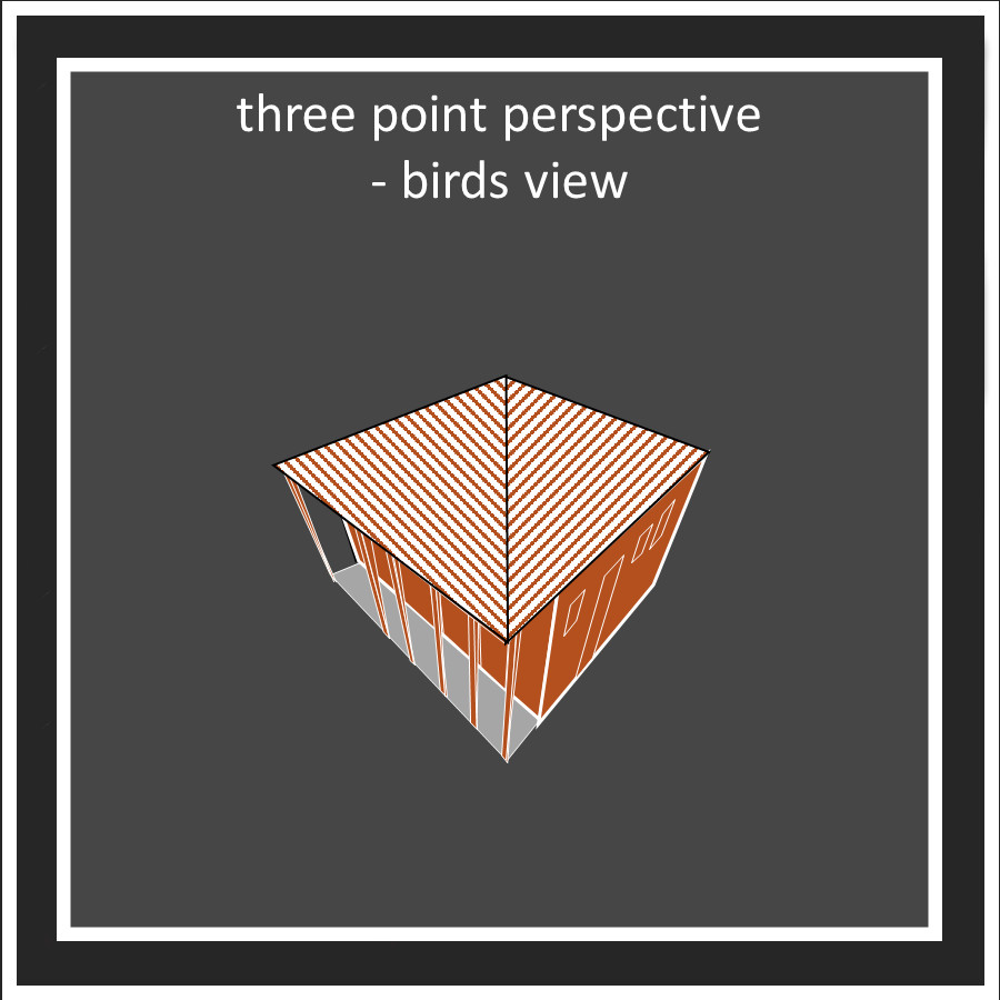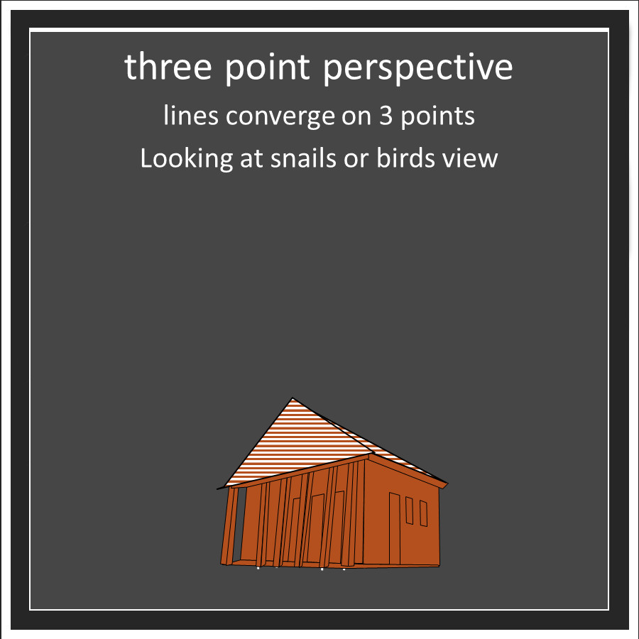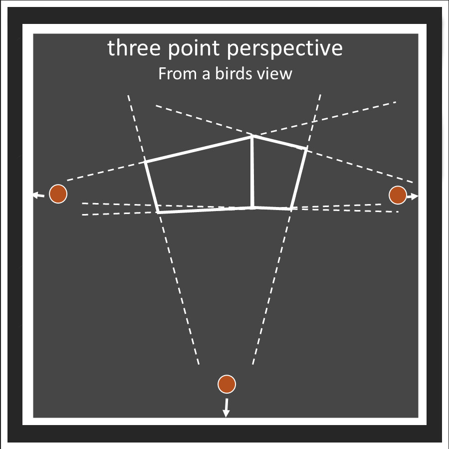 A 3 point perspective has the eye level looking down or up for the third point. it is like a snails view, or a birds eye view.