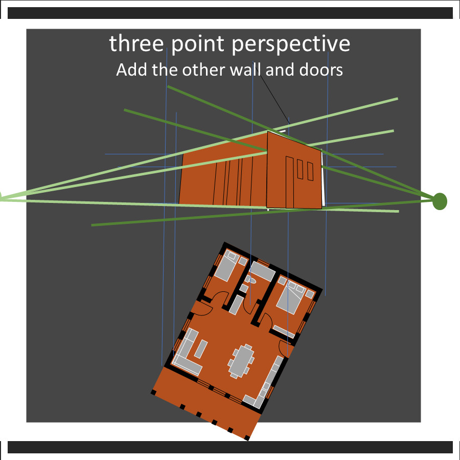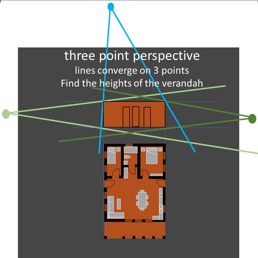to draw a 3 point perspective use the lines from the plan and elevation to find the measurements