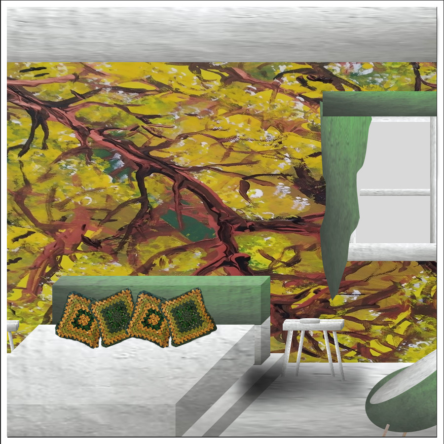 wallpaper continues to play a part - with impact! Floral references are seen. Jeanene's wattle painting is perfect.