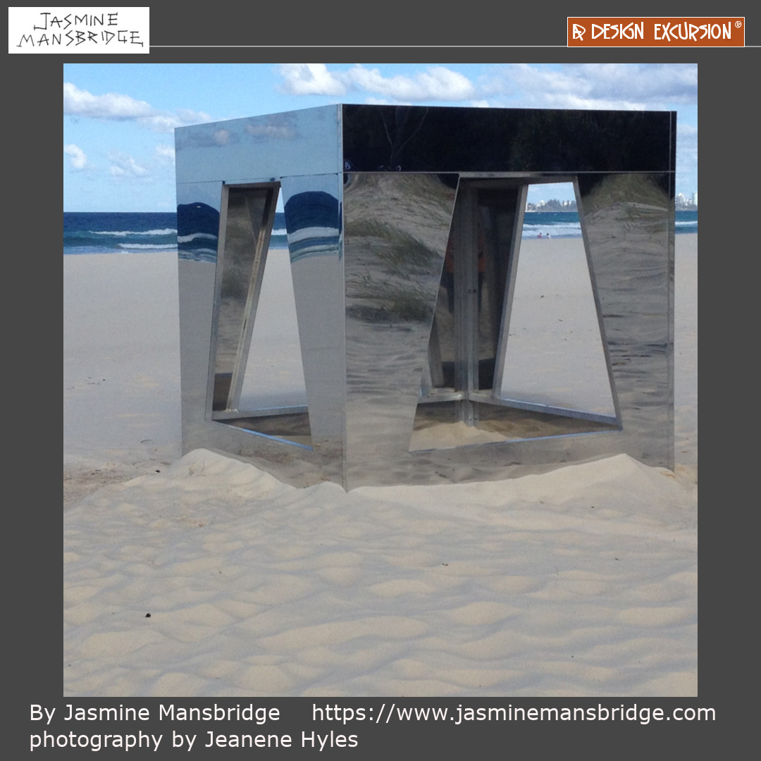 You/Me/Sky/Sea, by Jasmine at the Swell Sculpture festival on the Gold Coast. This sculpture focuses on the timeless nature of our engagement with our environment, with ourselves and with each other. The cube with its shapes cut out is a kind of thought catcher. The inside being a reminder of the value of spending time in contemplation and the value of human connection.